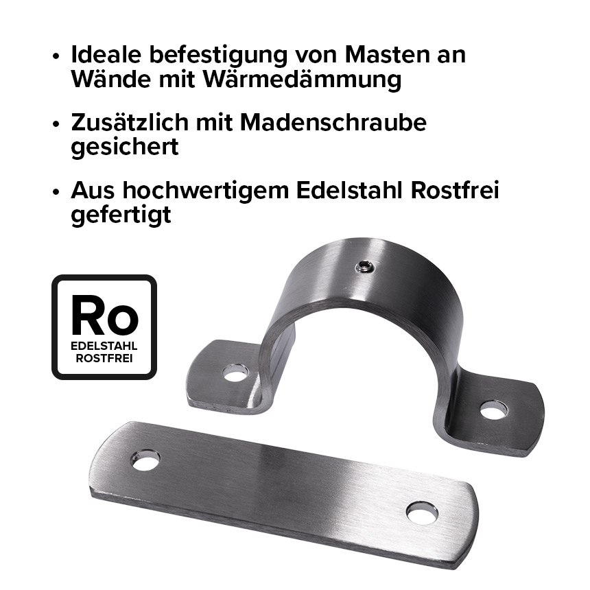 Sichere Befestigung des Mastens an Mauern bzw. Wände. Zur professionellen und sicheren Befestigung eines Mastens an einer Mauer bzw. an einer Wand benötigt man mindestens 2 Schellen, welche im Abstand von minimum 30 - 50 cm zueinander montiert werden sollten.